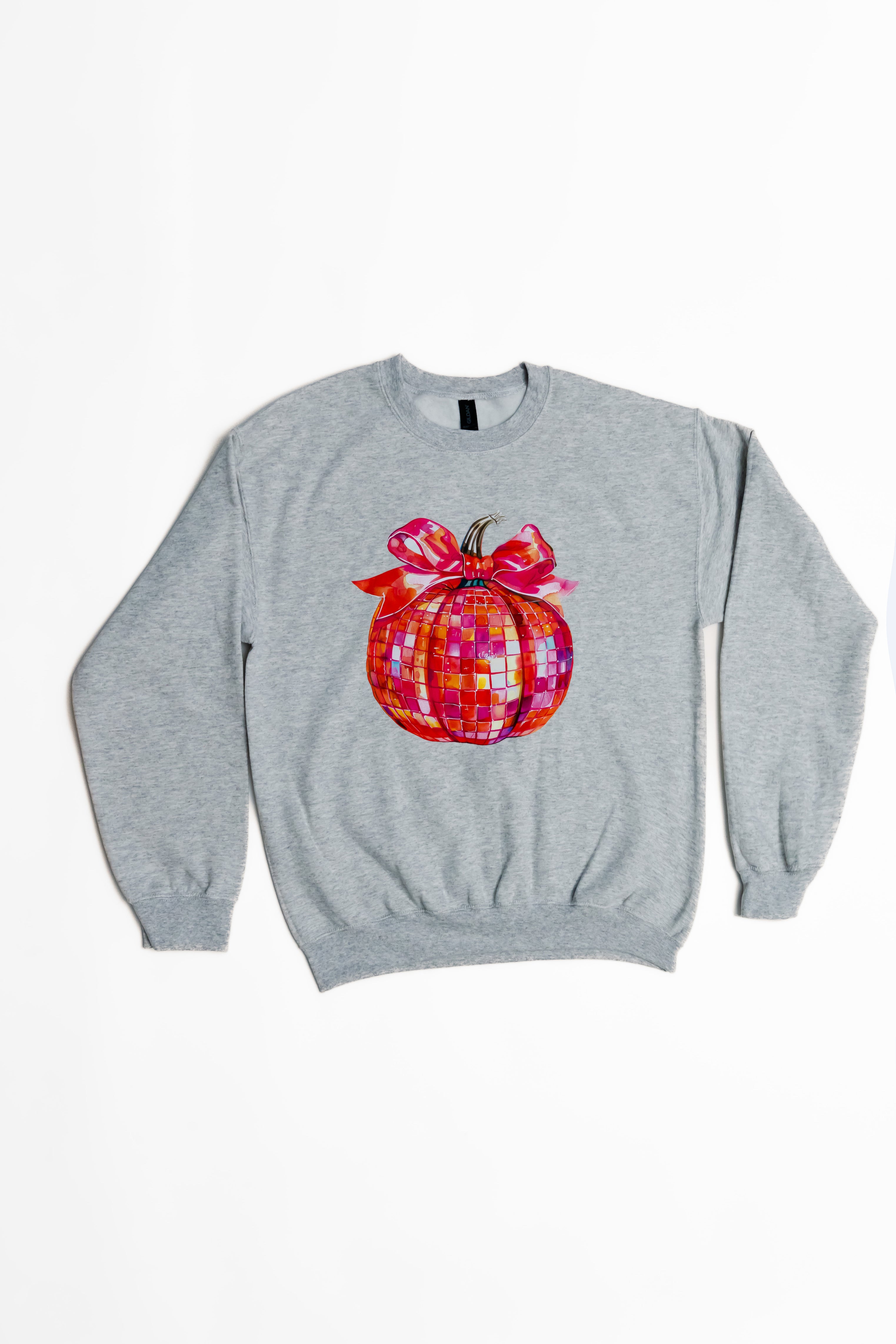 - Bring on the festive vibes with this stunning Disco Glam Pumpkin! Featuring a playful mix of pink, orange, and coral mosaic tiles, this pumpkin shines like a disco ball while keeping those cozy fall feels. The bold camo-print bow tied at the stem adds a fun, trendy twist – making it the perfect mix of spooky and chic on the grey sweatshirt. Retail Value $19. Probability of receiving this sweatshirt, 100%