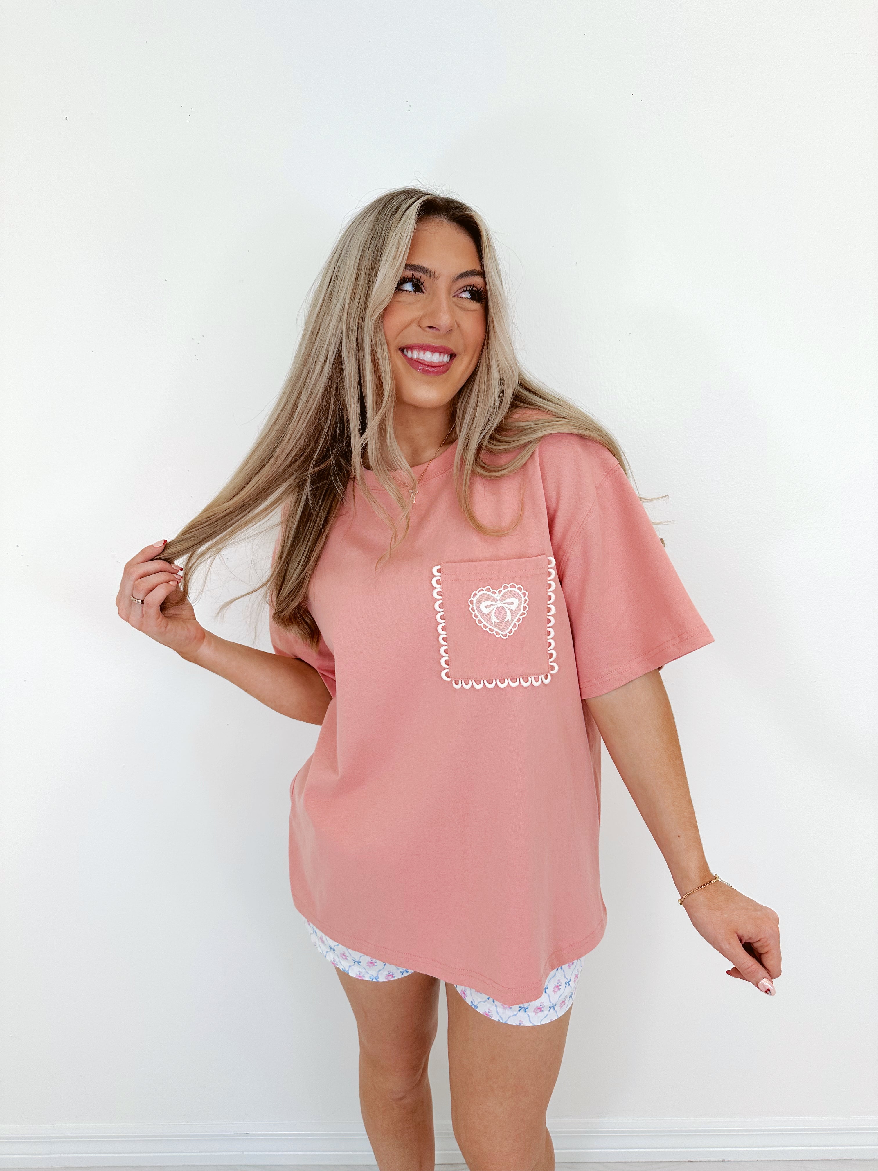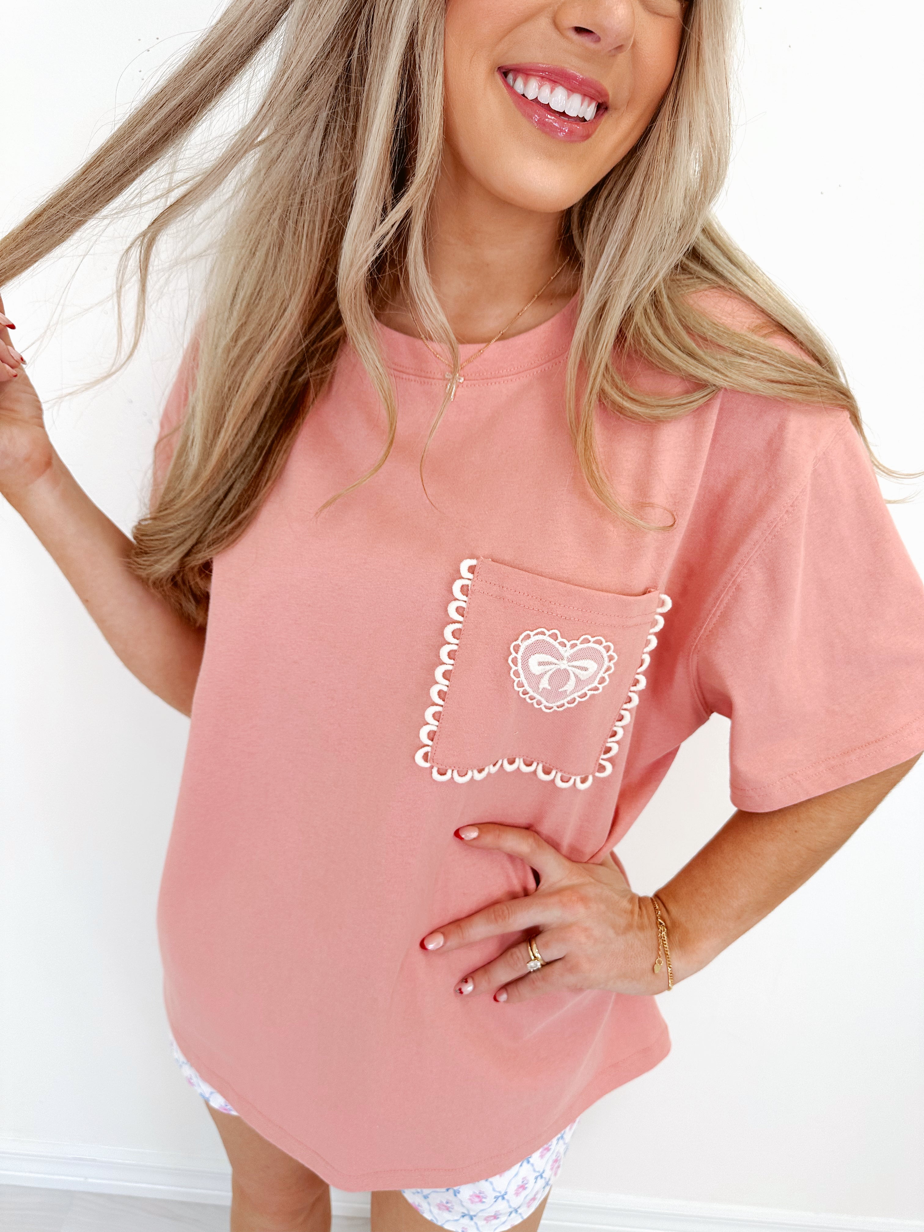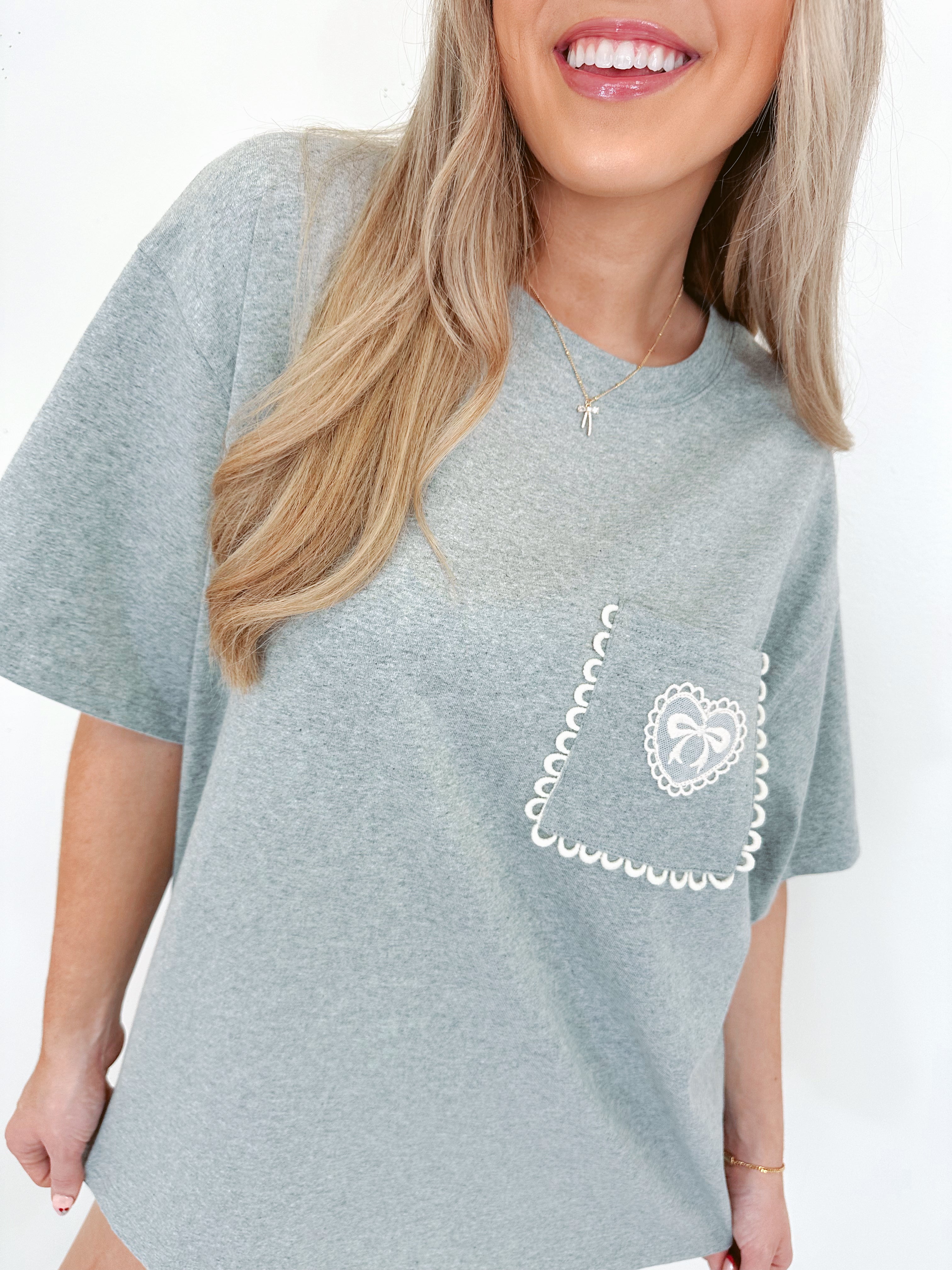 - Features a cotton fabric, a crew neck, a loose fit silhouette with short sleeves, ans is completed with a fancy lace trim and heart patch pocket.
