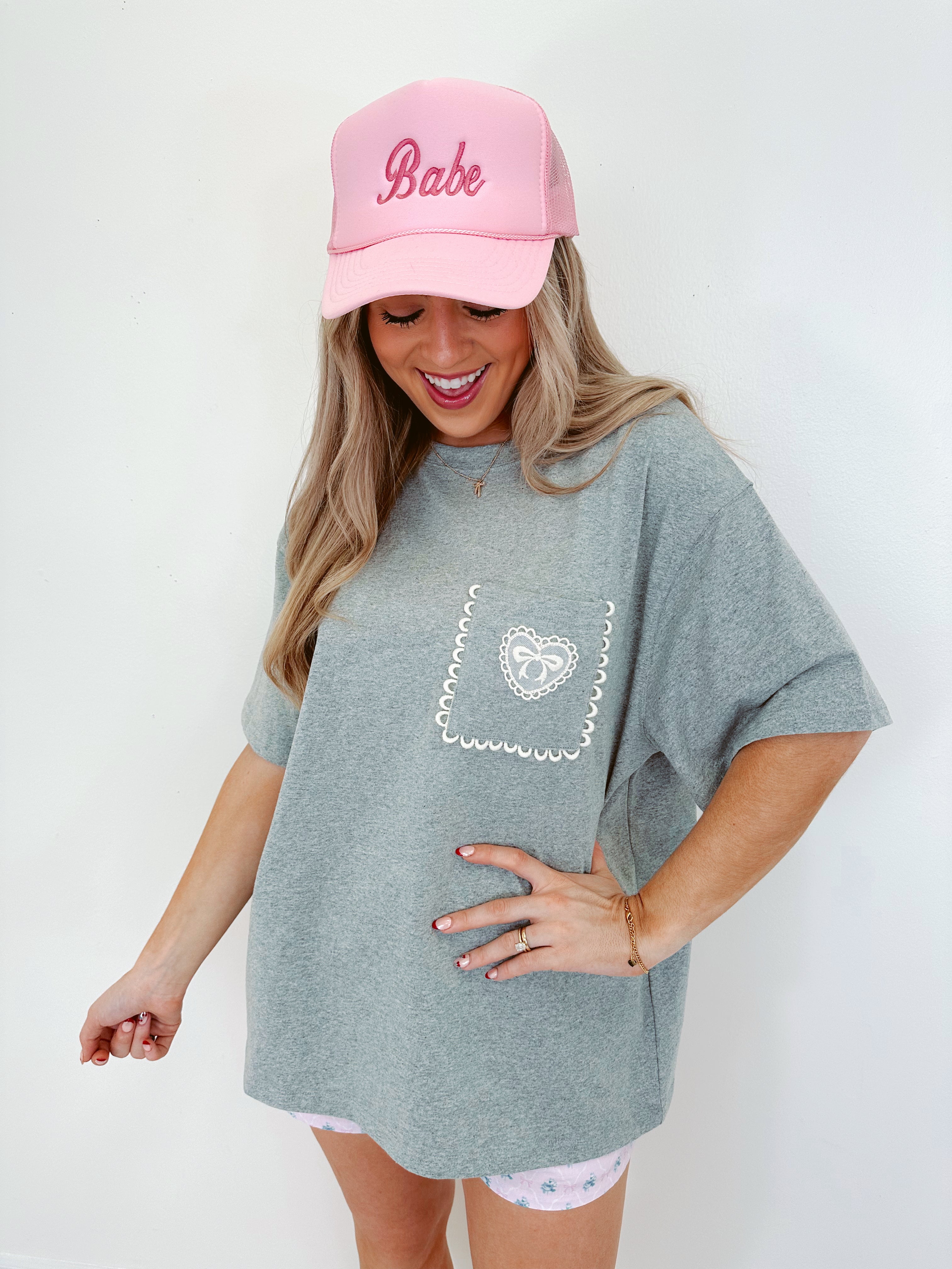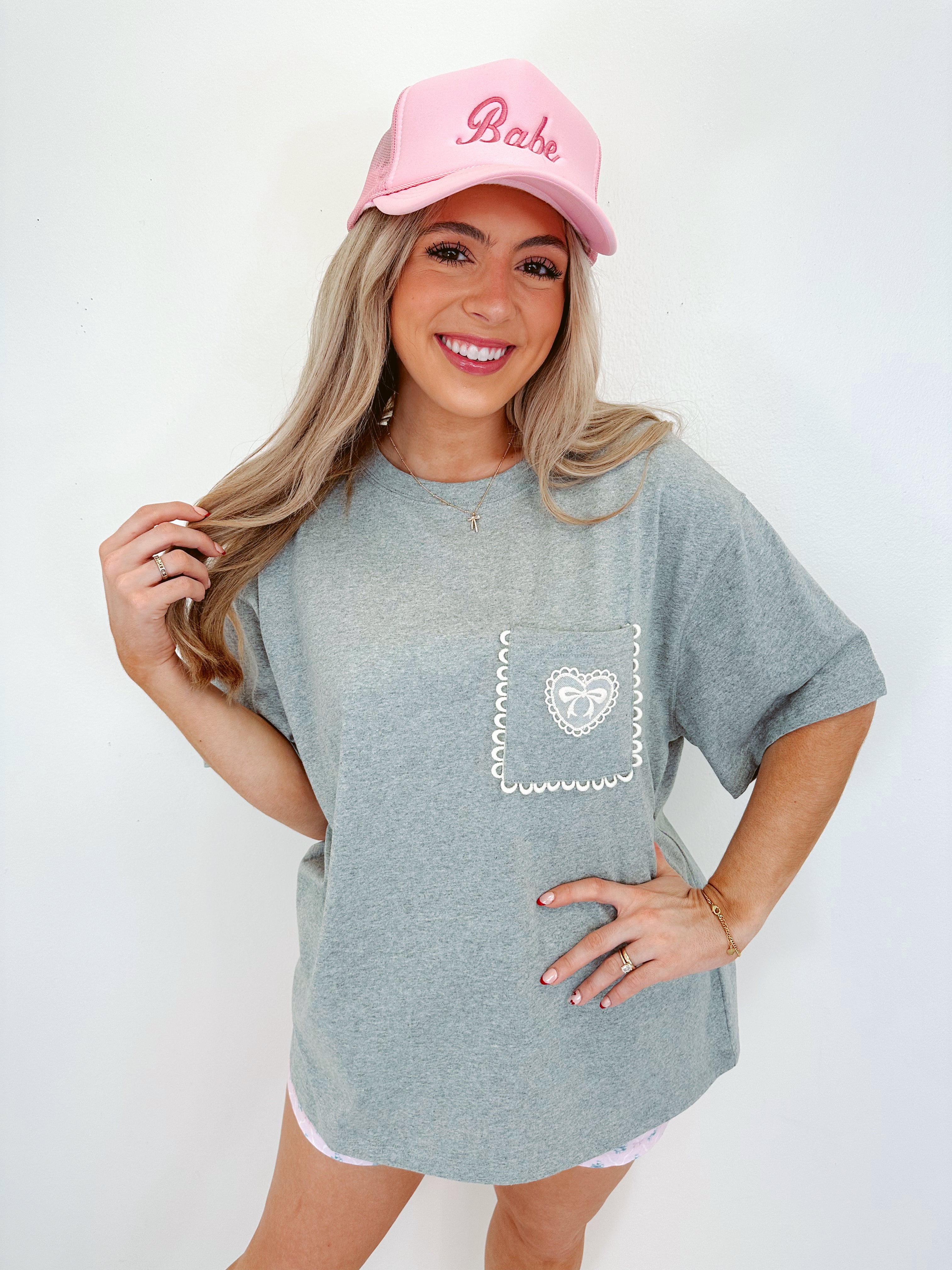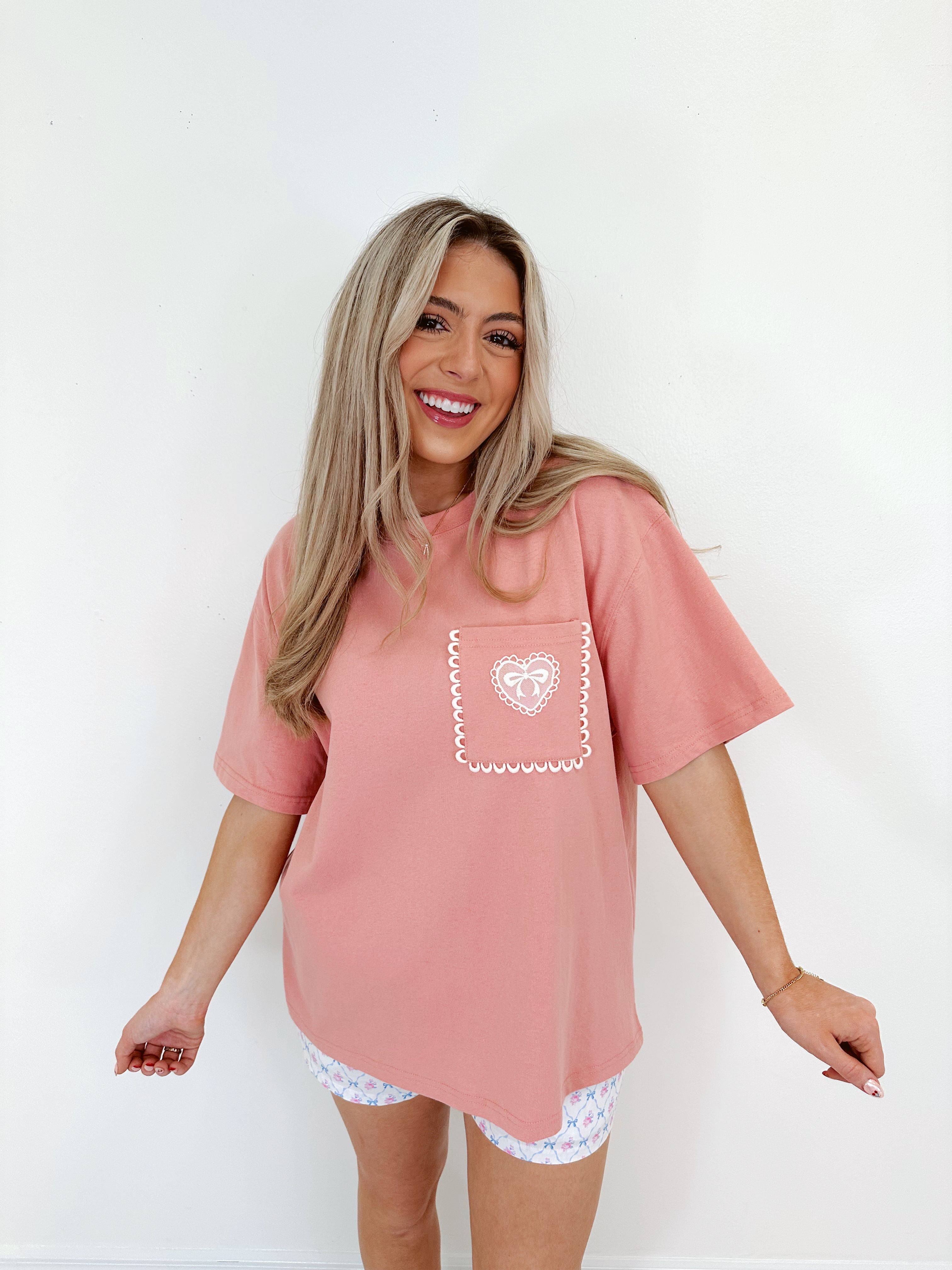 - Features a cotton fabric, a crew neck, a loose fit silhouette with short sleeves, ans is completed with a fancy lace trim and heart patch pocket.