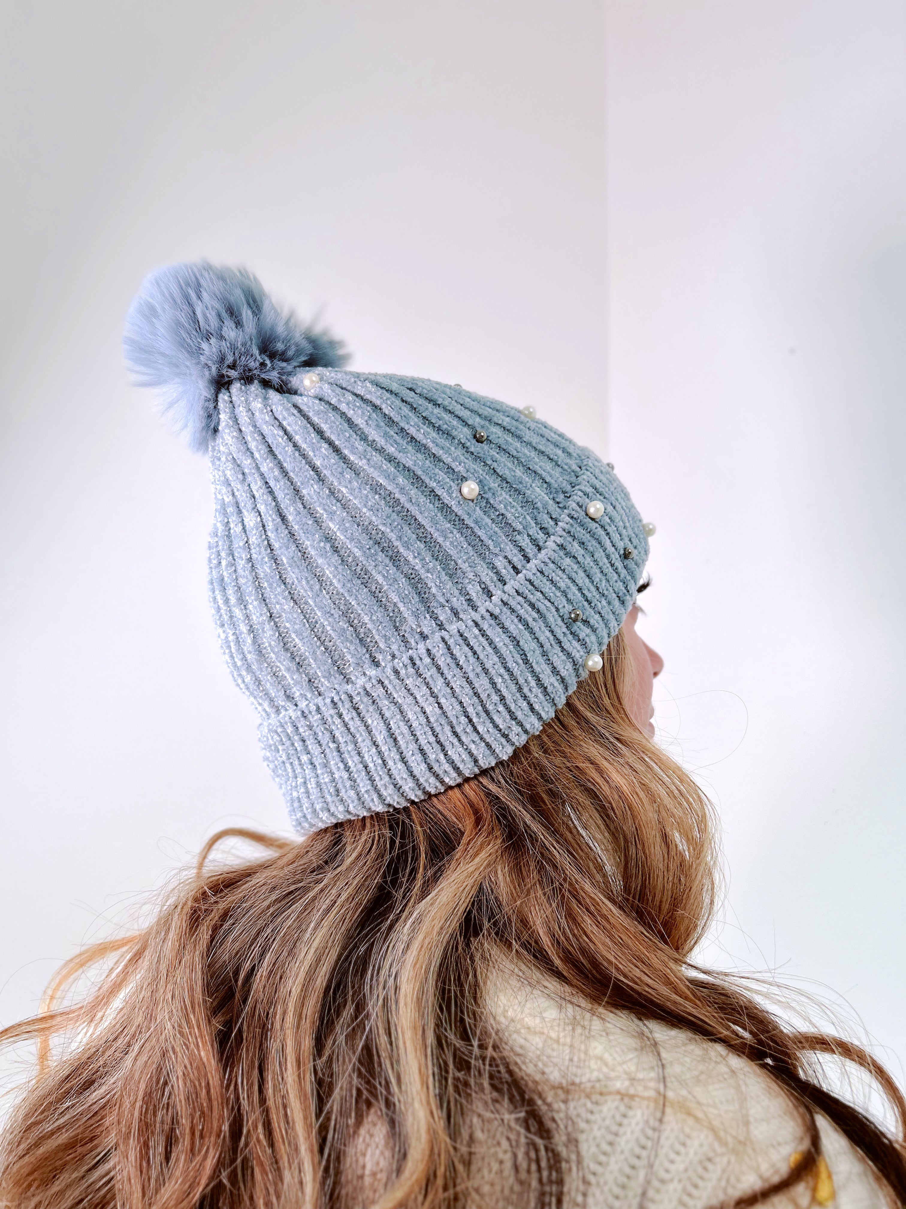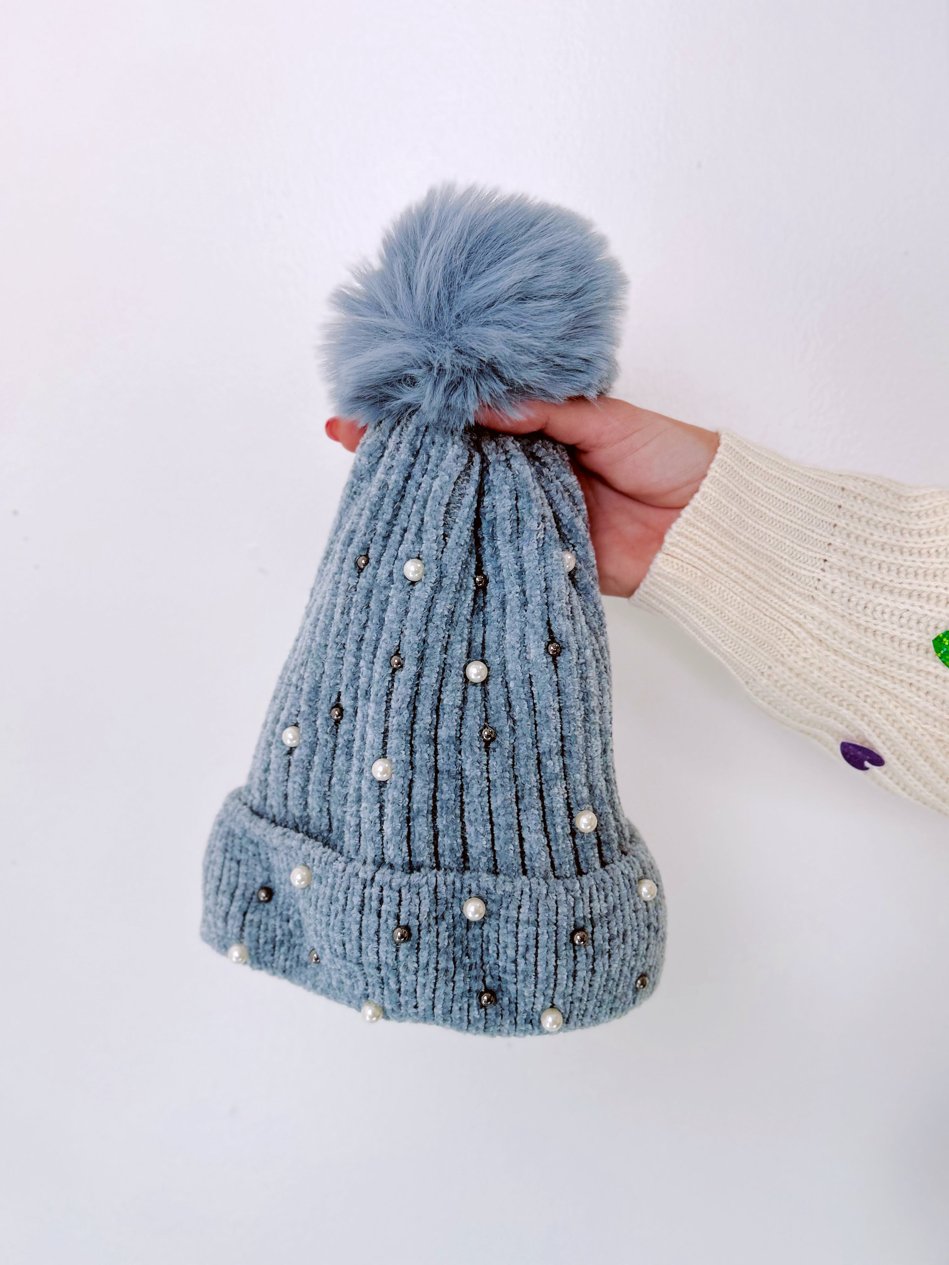 - Our Pearla Adorned Pom Beanie is a must have accessory this season! This pom beanie will elevate your style for a bold, trendy look.