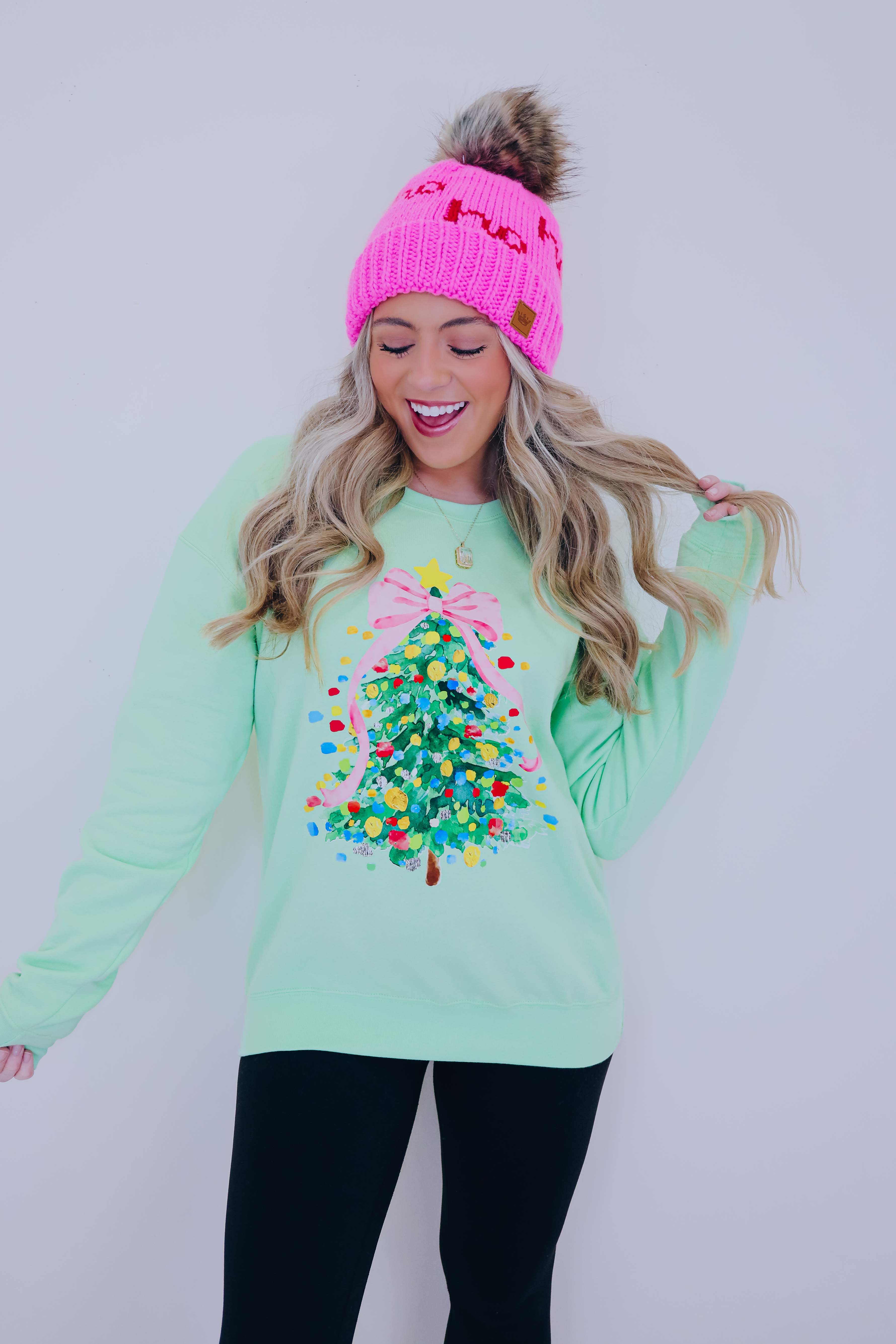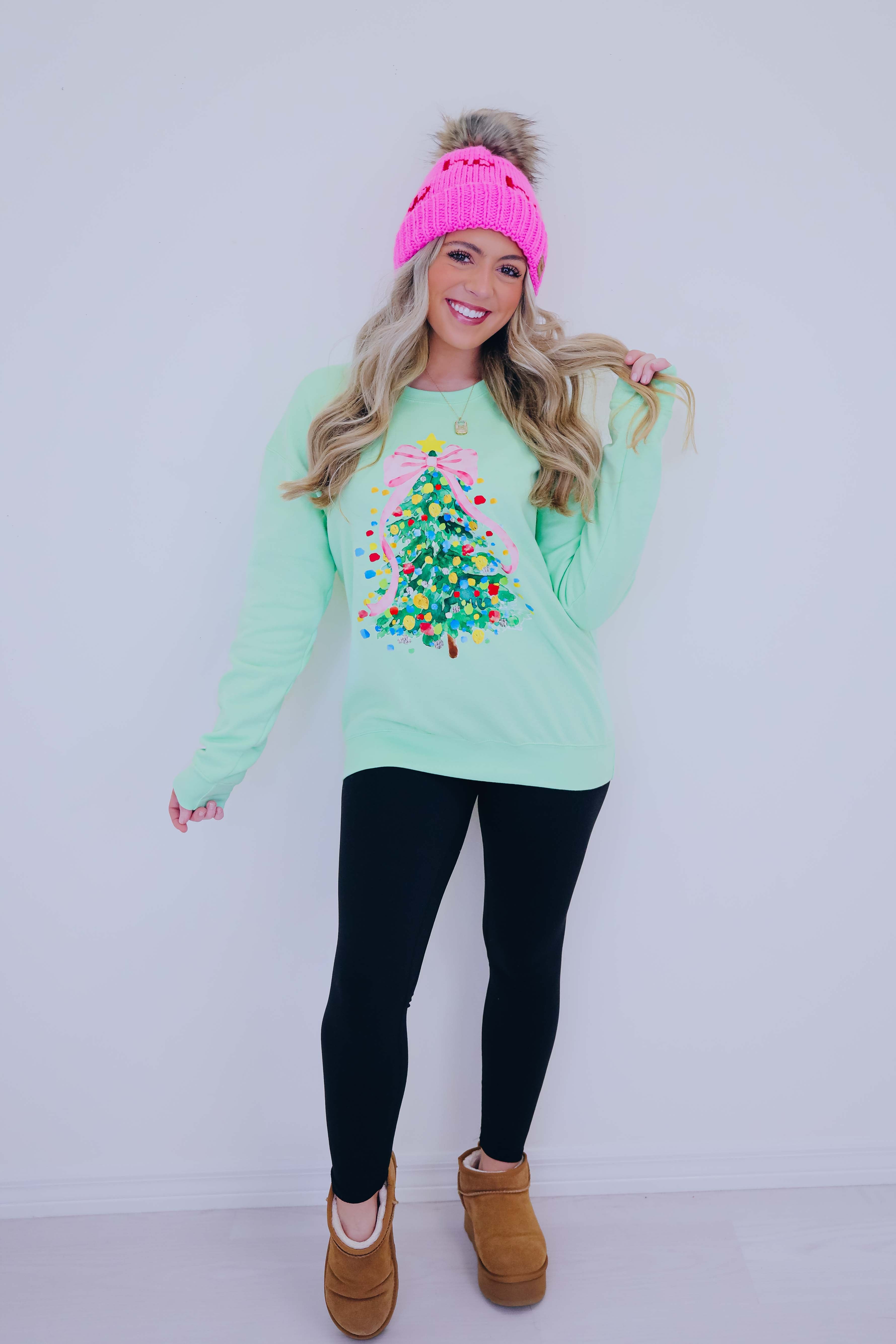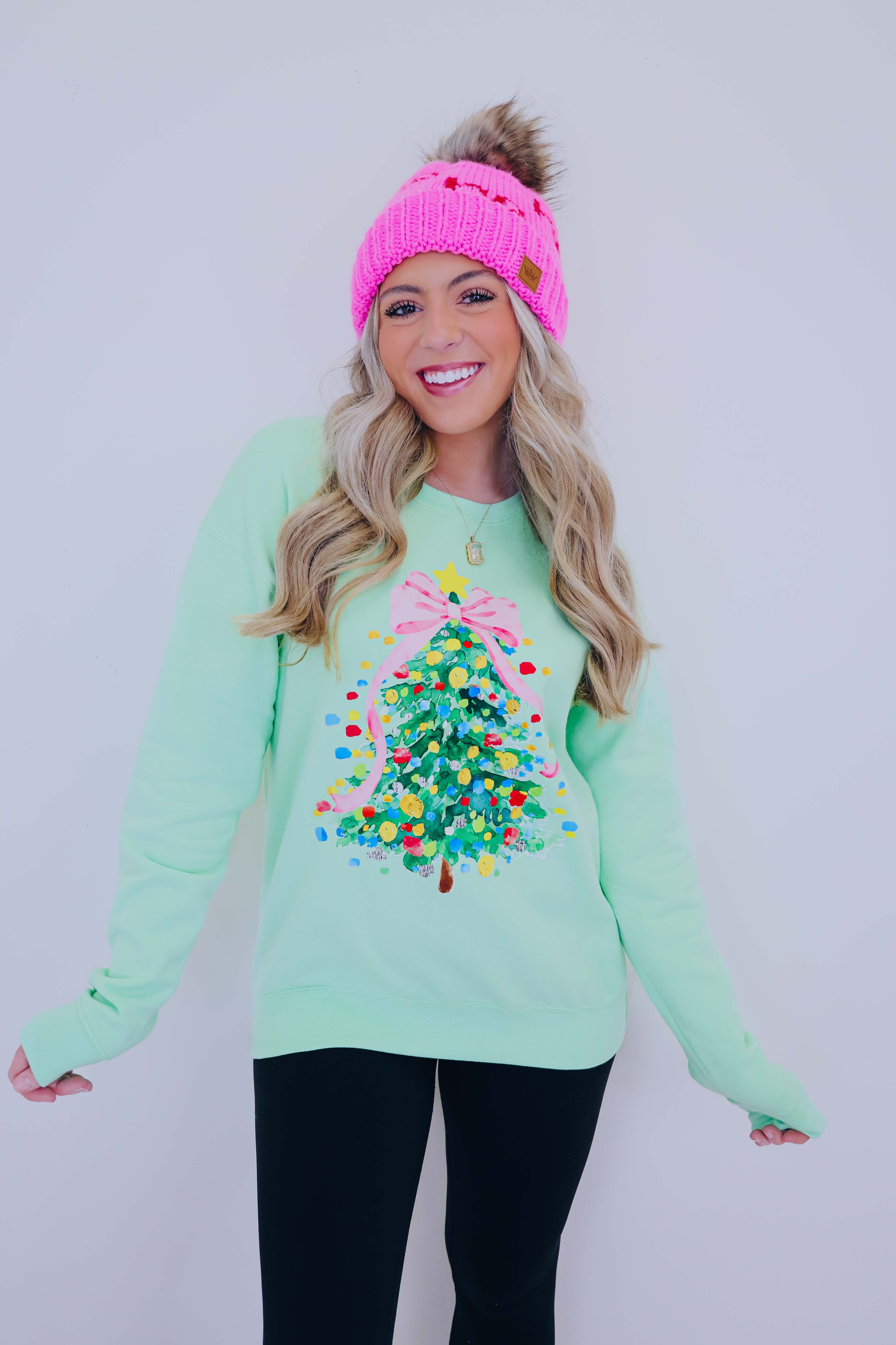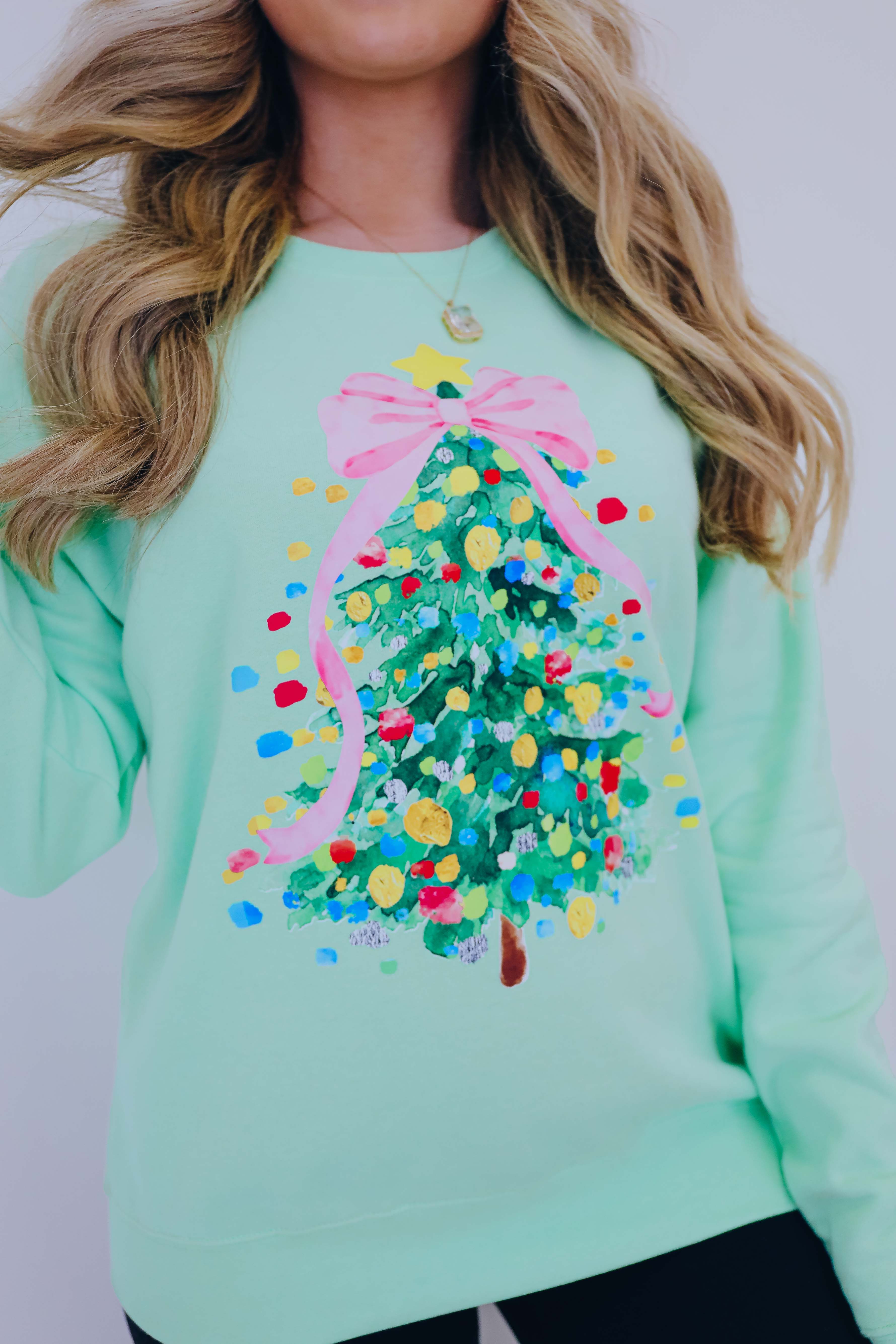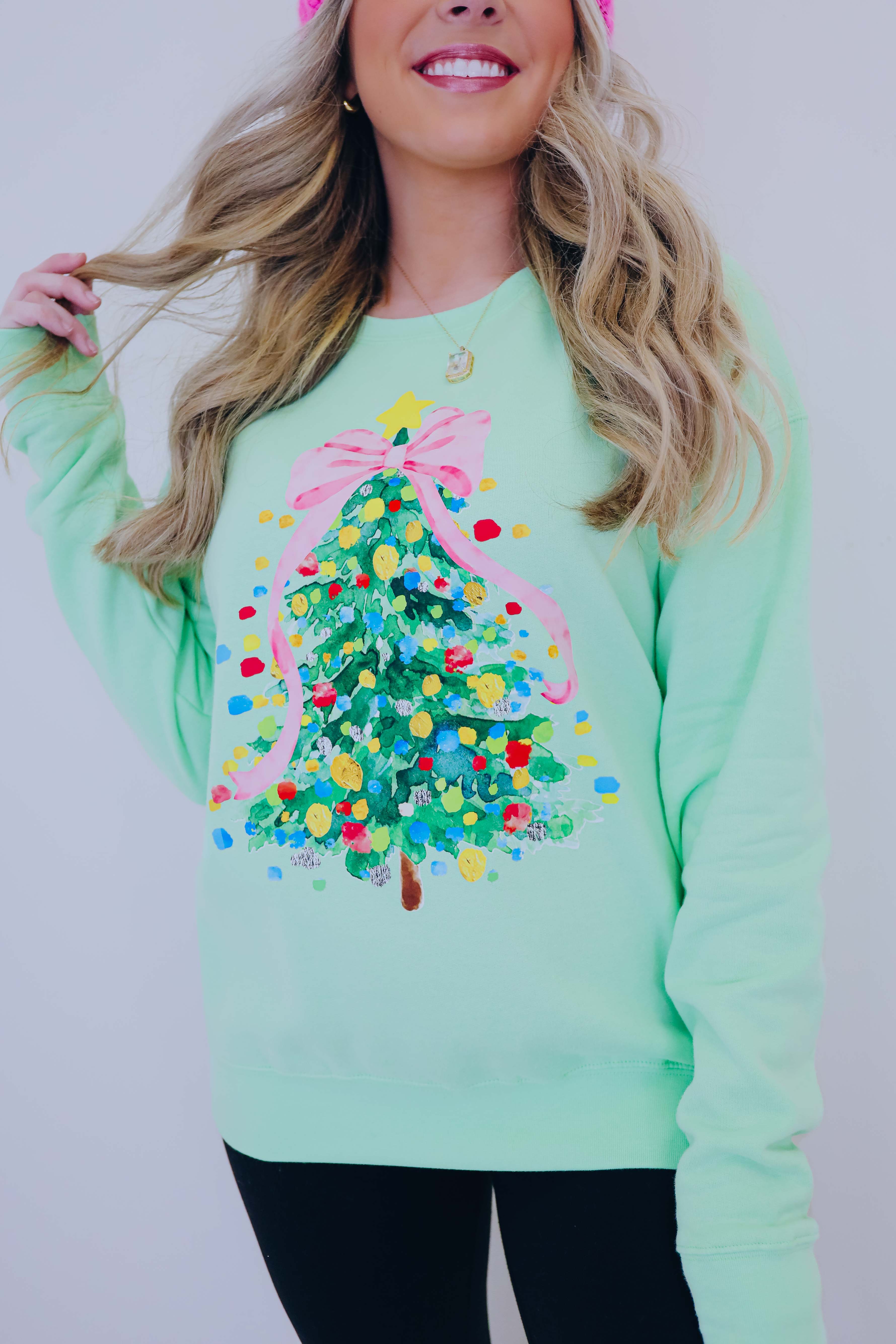 - Bright, fun, and unique our Cascading Pink Christmas Tree Graphic Sweatshirt is super girly and is sure to add a feminine festive touch to your holiday wardrobe.