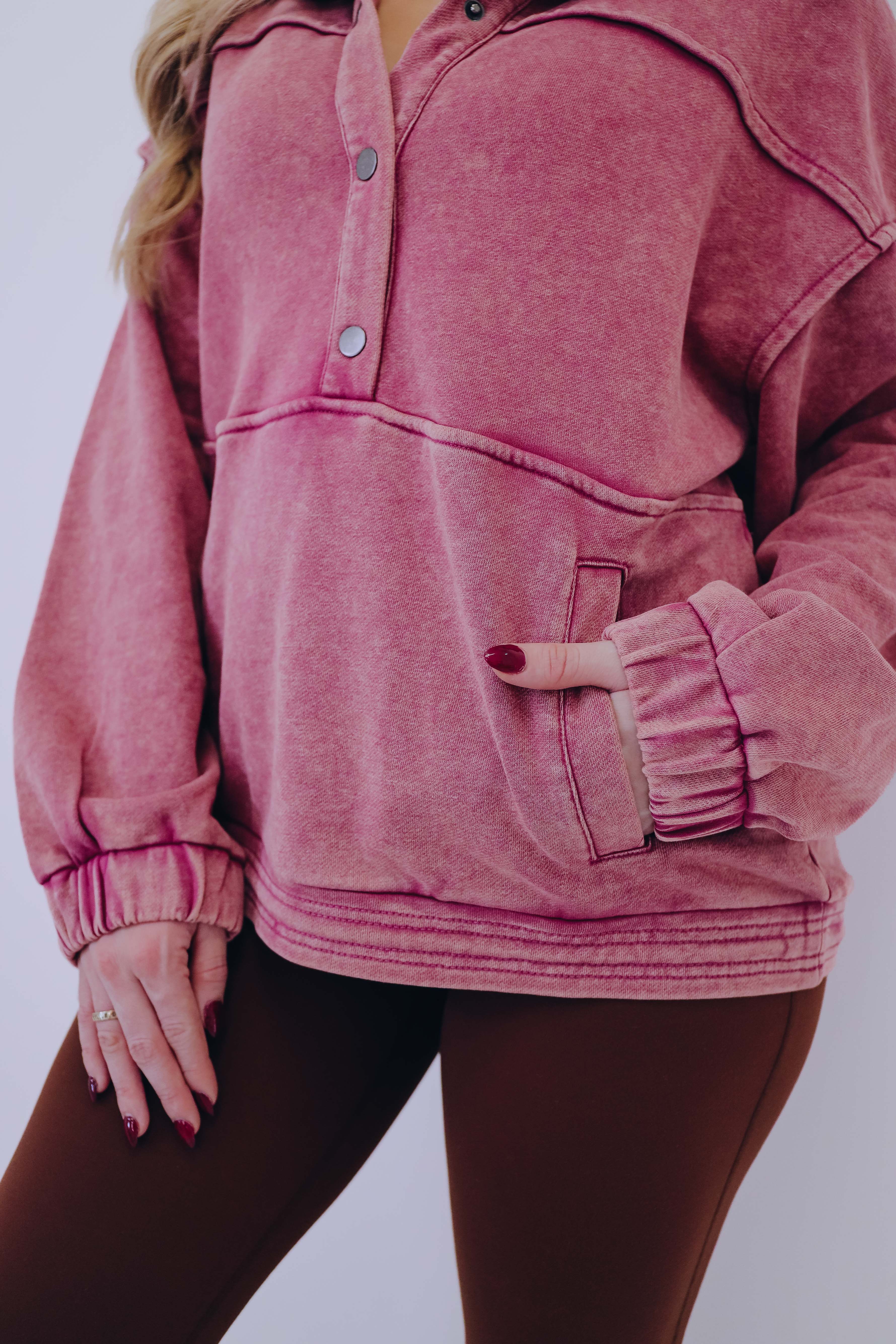 - Features a soft mineral washed jersey knit fabric, a mock neck quarter snap front closure, a full length sleeve with elastic ribbed cuff, a kangaroo pouch pocket, and a straight ribbed hem with hidden drawstring for he perfect fit.