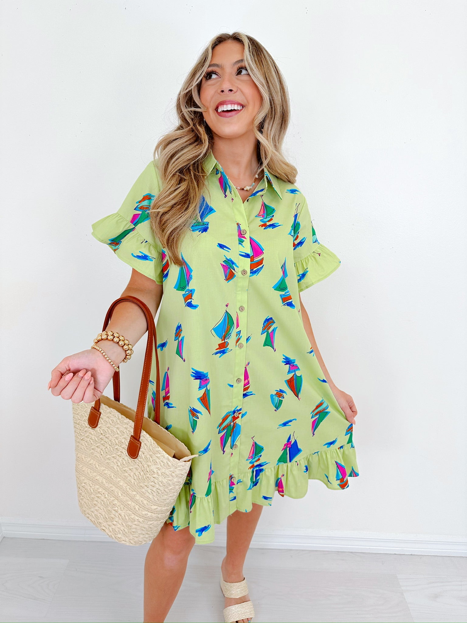 - This collard button front shirt dress features a cotton blend fabric with a colorful sailboat print, a short ruffle trim sleeve, side slit pockets, and a ruffle hem.