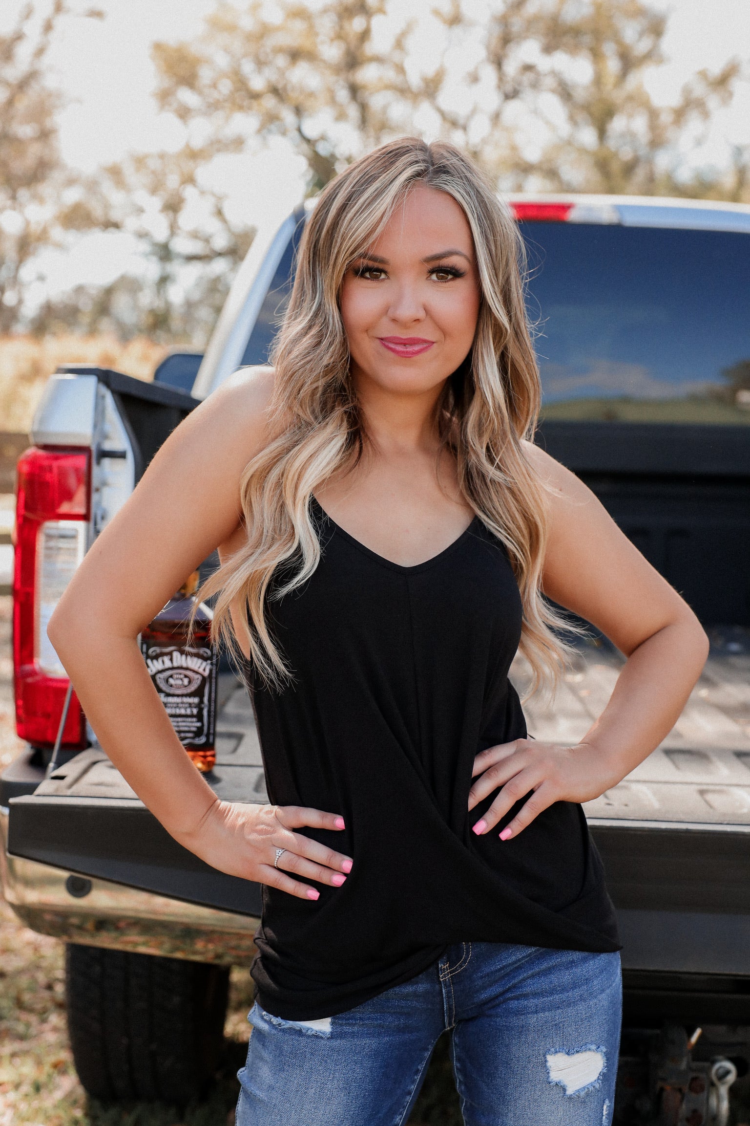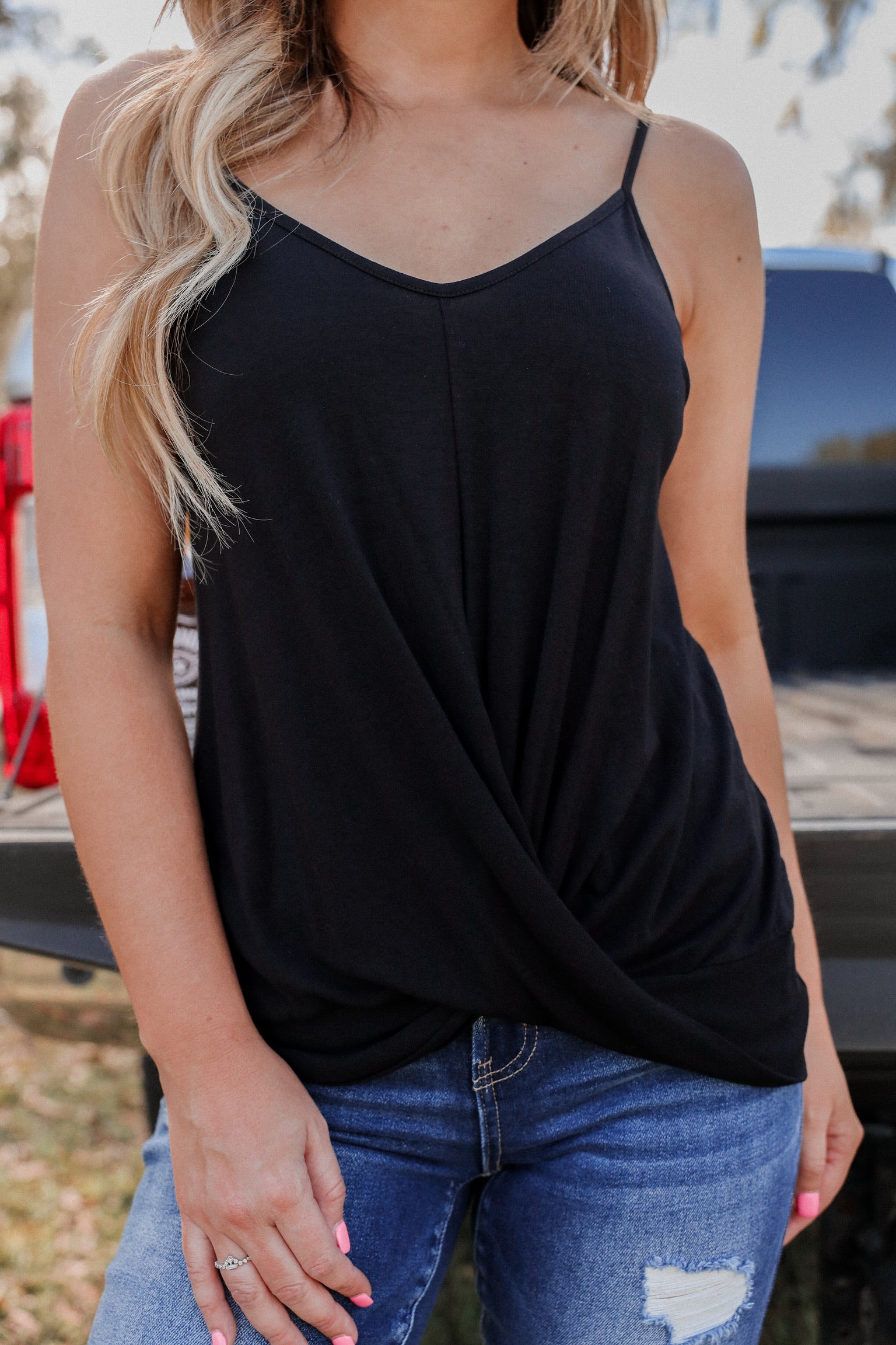 - Features a soft solid knit fabric, spaghetti straps, V-neck, and a knotted wrap detailed hem.