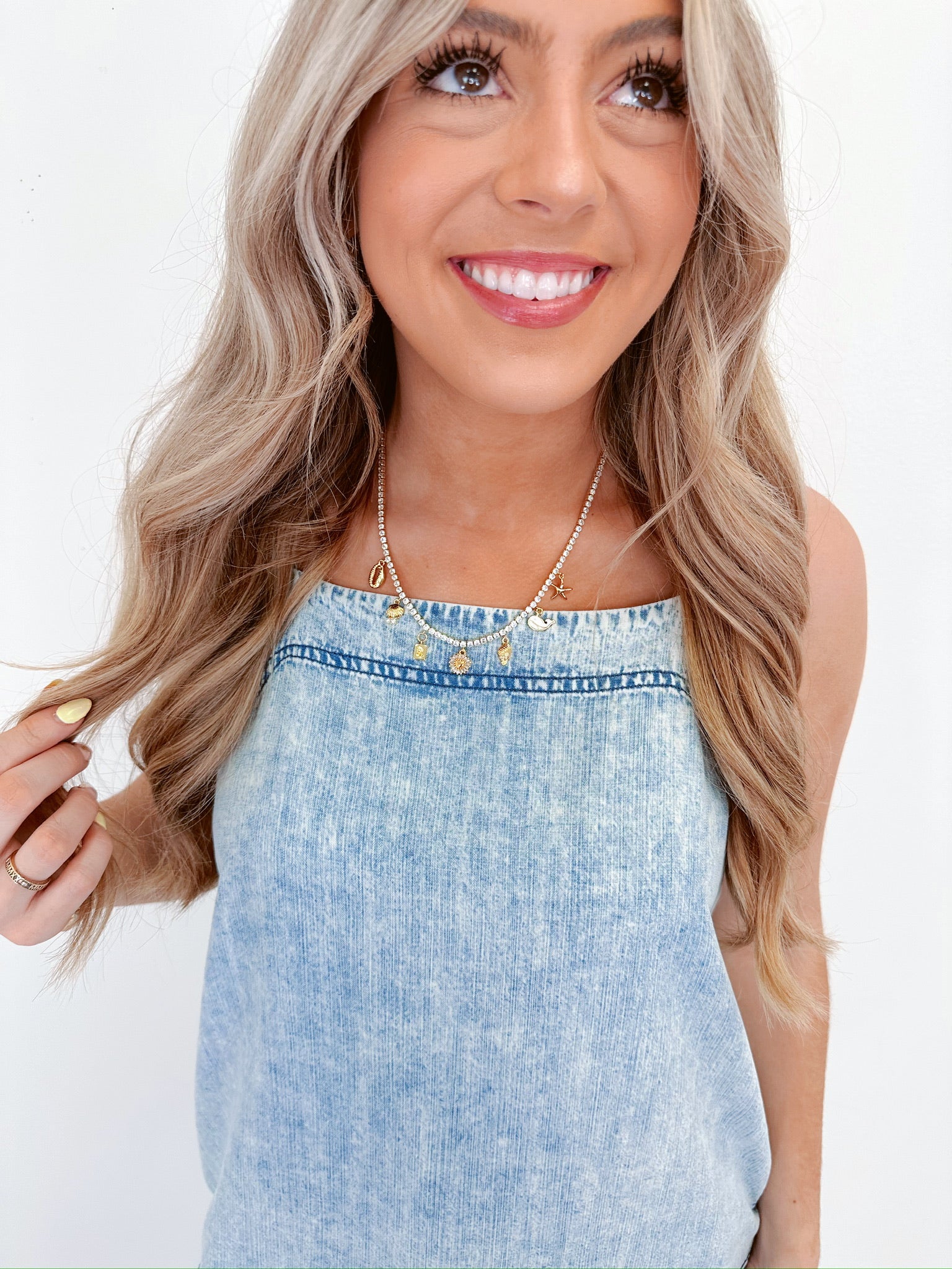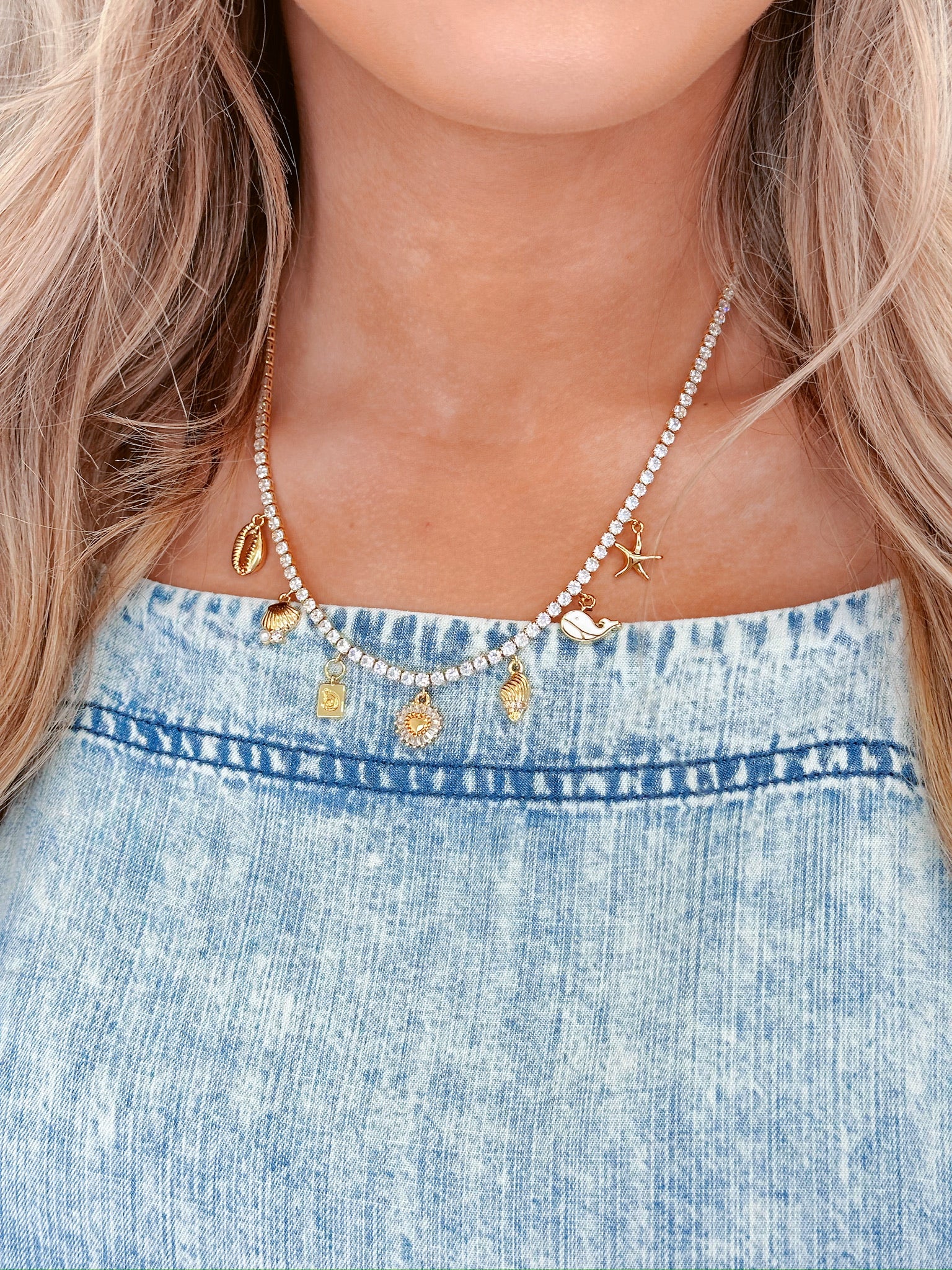 - Our Shimmering Shore Charm Necklace is a super sparkly must have. Elevate your wardrobe with this charming necklace and add a chic touch to your date night fit.