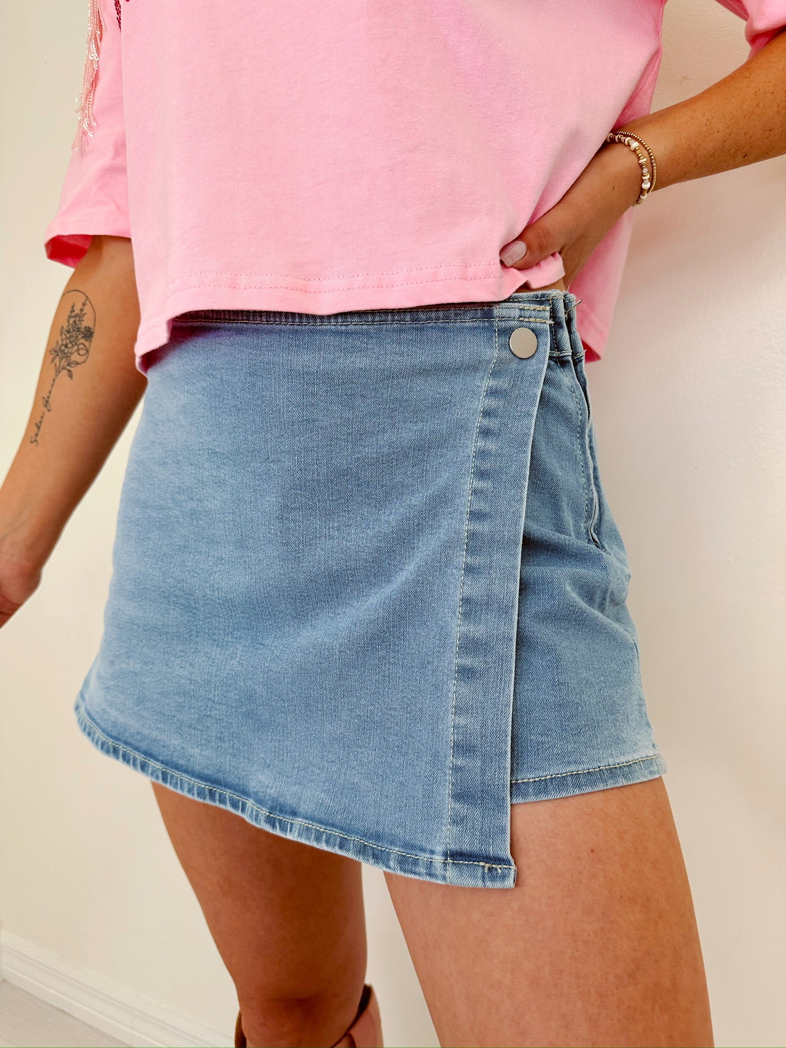 - Everyday function and flirty style are combined to create our Skye Denim Mini Skort. A summer must-have, this cutie can be styled with your fav western graphic tee and boots for a rodeo or concert fit. Or with a cute floral top and sandals for a brunch date with your bestie.