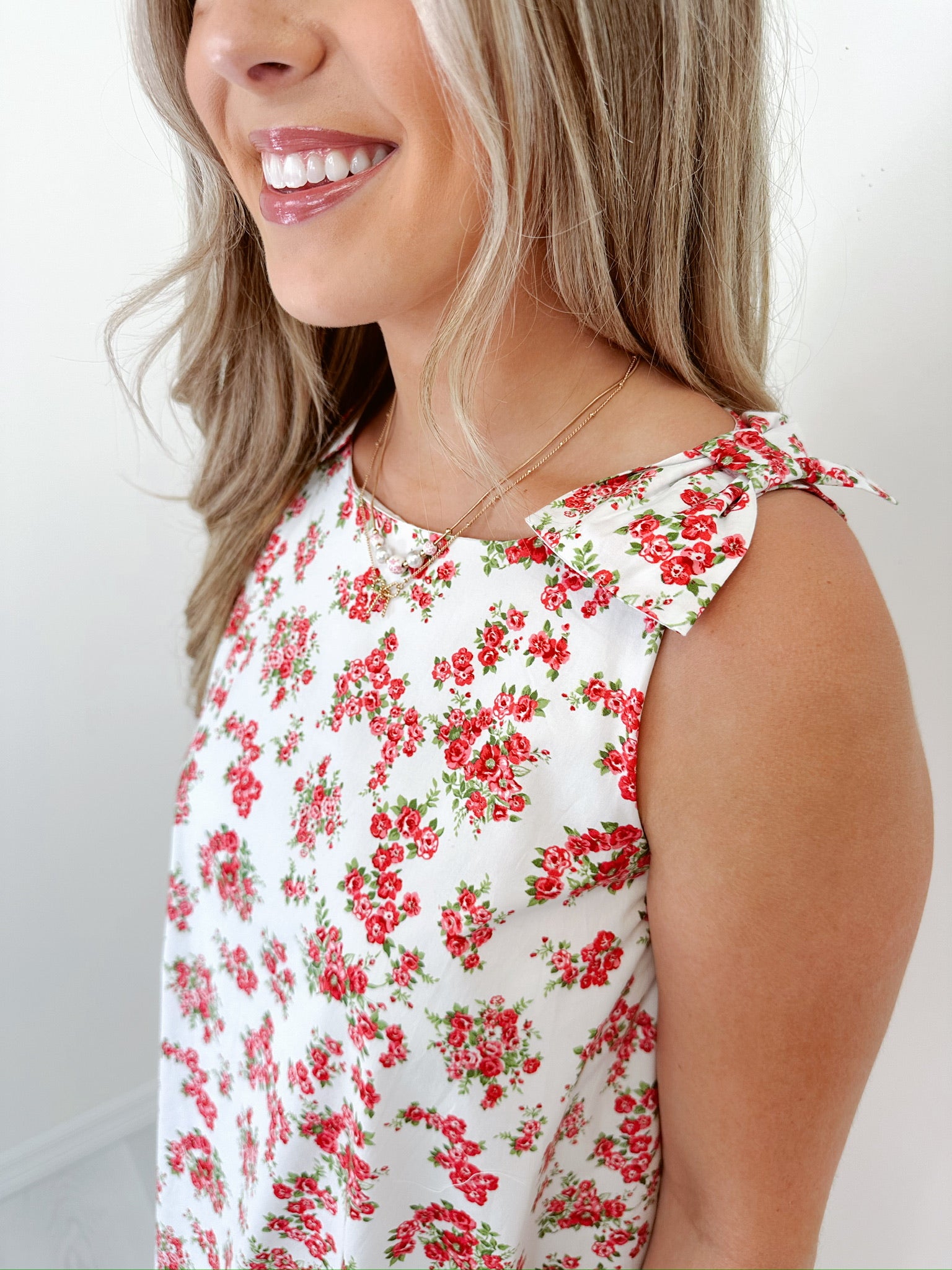 - Featuring a ditsy floral poplin print fabric, a square neck, a sleeveless silhouette with a wide big bow detail strap, a bubble hem and is fully lined with an invisible back zip closure.